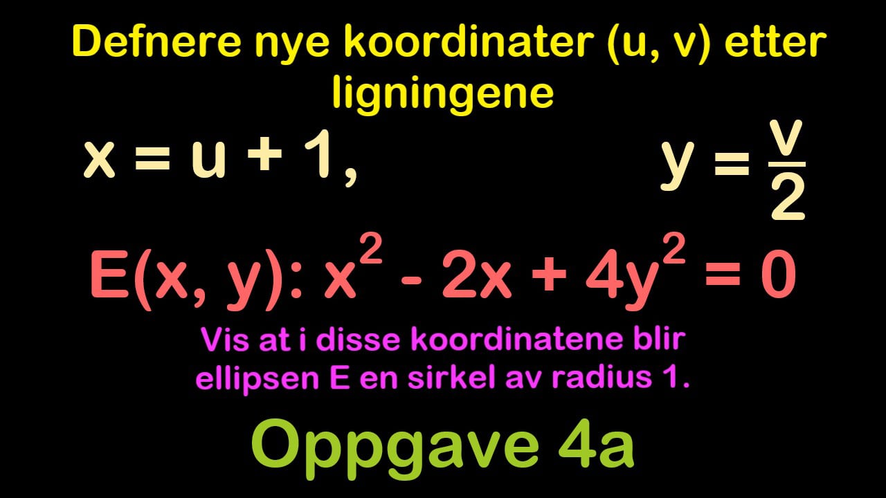 Betrakt ellipsen E definert av ligningen - x^2 − 2x + 4y^2 = 0 , Definere nye koordinater (u, v) etter ligningene x = u+1 , y = v/2 - Vis at i disse koordinatene blir ellipsen E en sirkel av radius 1 - Eksamen matte 3000 27.02.2020