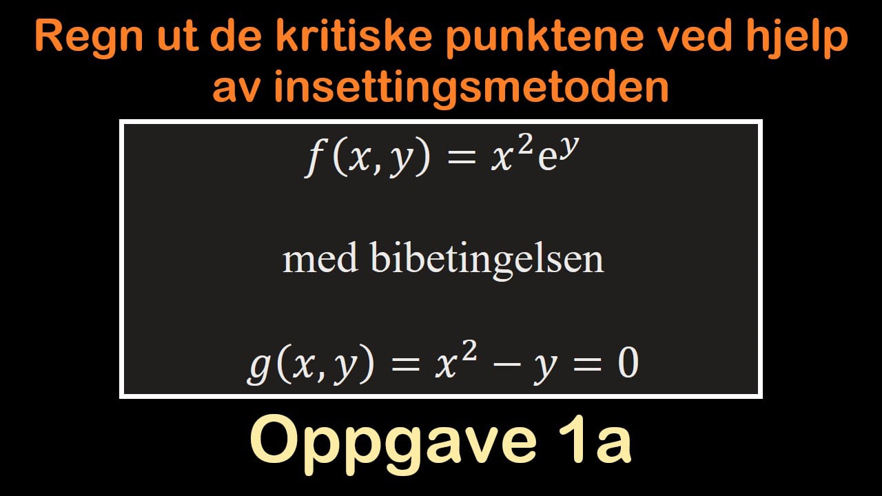 Betrakt den reelle funksjonen f(x, y) = x^(2)*e(y) med bibetingelsen g(x, y) = x^(2) − y = 0 - Bestem de kritiske punktene til f med bibetingelsen g = 0 ved bruk av insettingsmetoden
