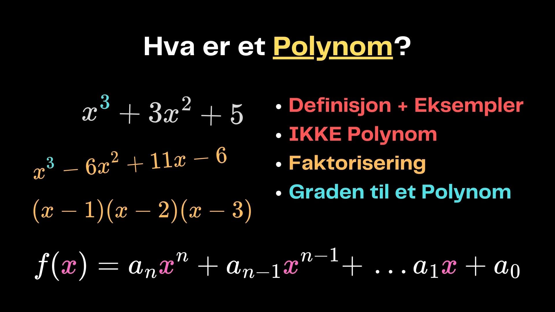 I denne videoen forklarer vi hva et polynom er, ser på eksempler på polynomer og uttrykk som ikke er polynomer, og hva graden til et polynom betyr. Vi nevner også at polynomer kan faktoriseres.