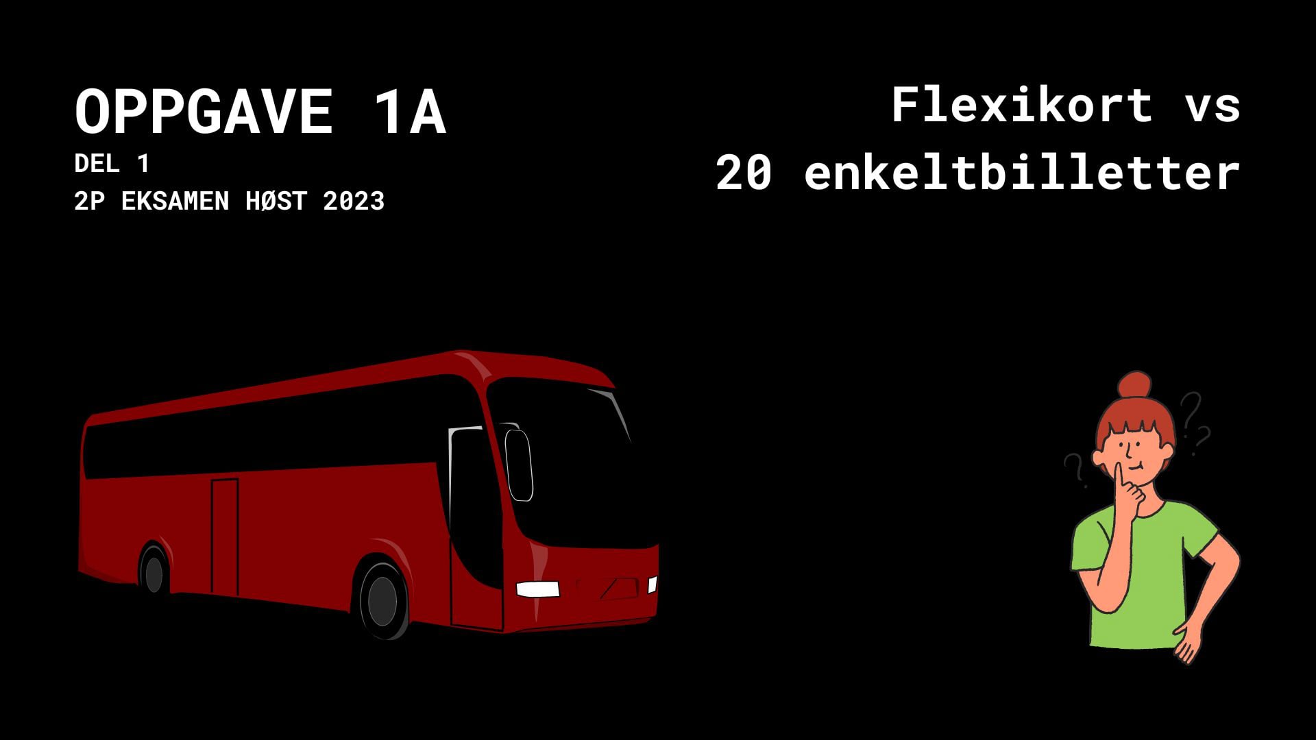 Selma er på ferie og vil bruke buss for å komme seg rundt i området. Hun vurderer om hun skal kjøpe en enkeltbillett for hver reise eller et fleksikort med 20 reiser.
