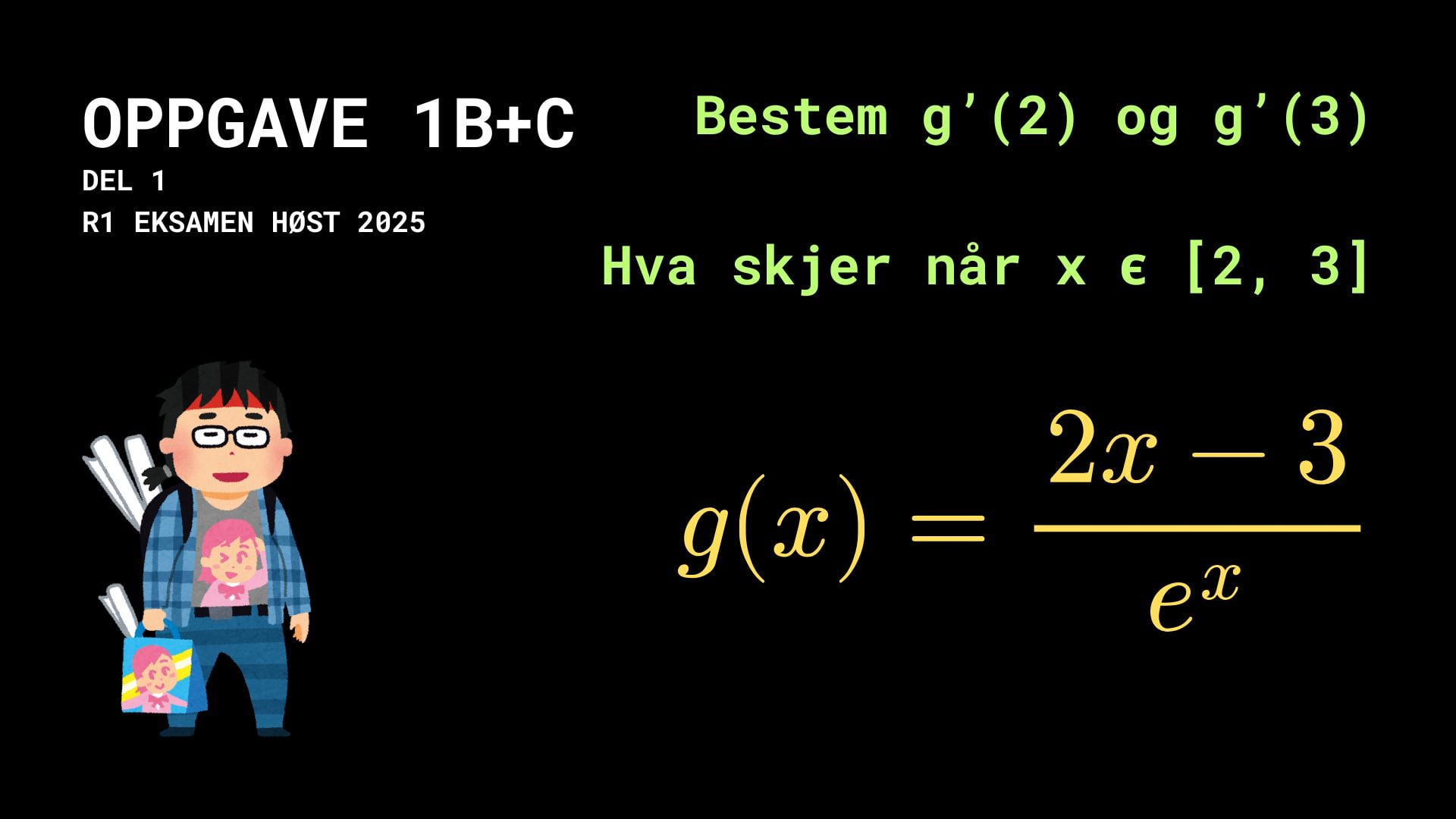 Funksjonen g gitt ved g(x) = (2x - 3)/e^x er kontinuerlig og deriverbar for alle x ∈ R.
