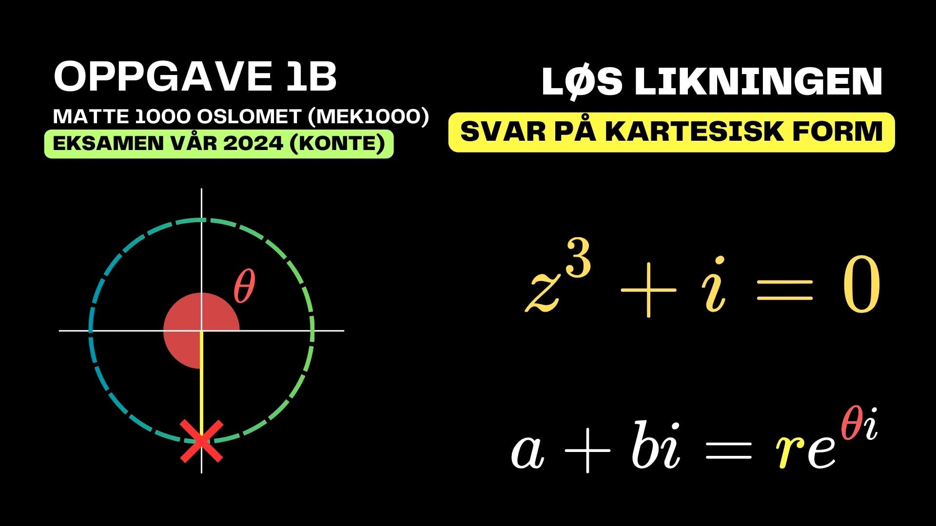 I denne videoen ser vi på likningen z^3 + i = 0. Vi løser den kartesiske likningen og skriver så svaret på kartesisk form.