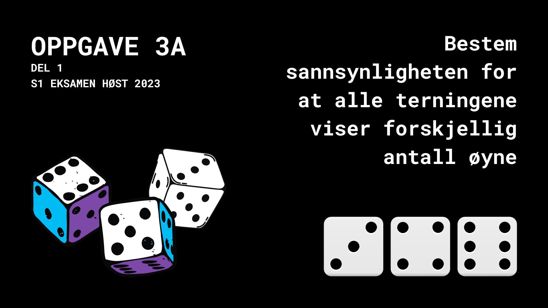 a) Bestem sannsynligheten for at alle terningene viser forskjellig antall øyne.