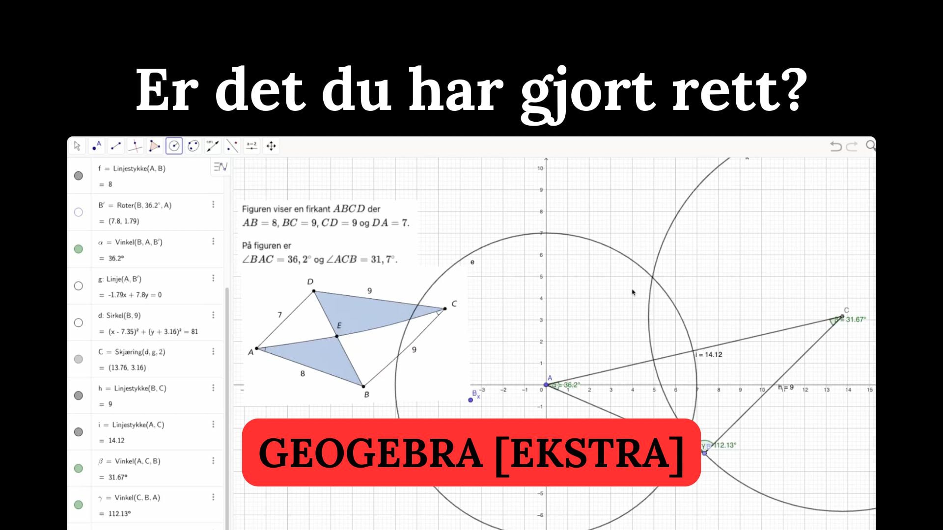 I denne videoen sjekker vi om det vi har gjort i oppgave 12 er rett ved å bruke geogebra. Dette er en ekstra video og er ment for deg som ønsker å ta forståelsen til det neste nivået. Vi går igjennom hvordan vi kan bruke et program som geogebra til å gjenskape oppgaven og bruker programmet til å sjekke vinkler, lengder og areal. Formålet er å vise hva som er mulig hvis man tenker litt utenfor boksen.