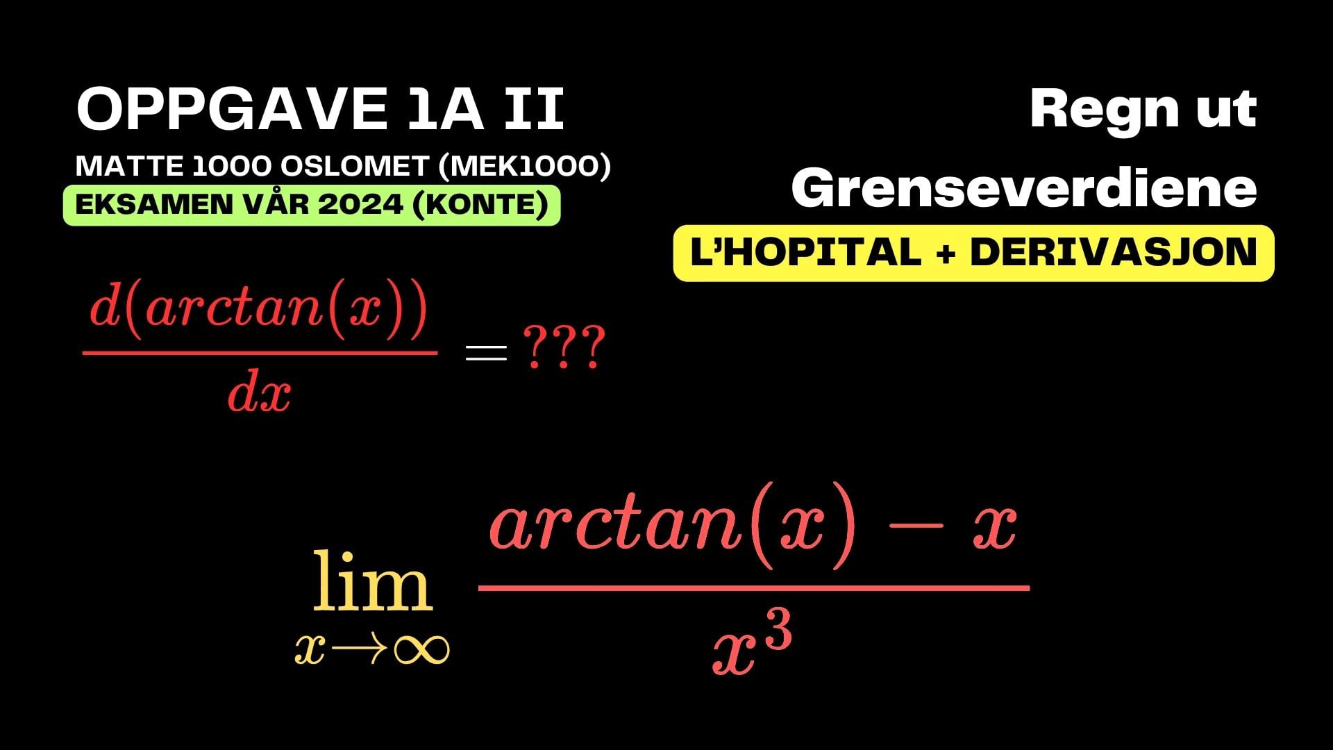 I denne oppgaven tar vi grensen til et uttrykk ved å bruke L'hopitals regel. Vi ser også på hvordan vi deriverer arctan til x.