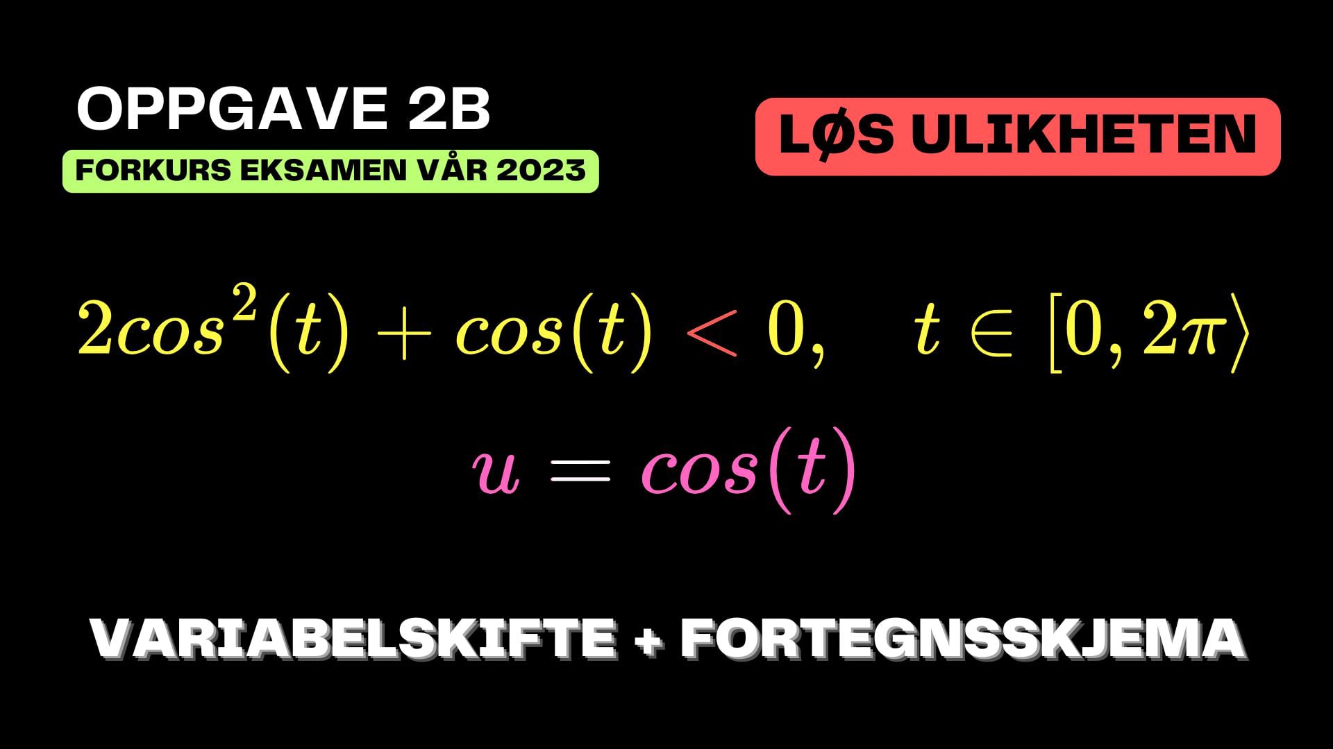I denne videoen løser vi en ulikhet ved hjelp av et variabelskifte. Etter variabelskiftet setter vi opp et fortegnsskjema for ulikheten før vi går tilbake til den opprinnelige variabelen. Oppgaven er utfordrende, så vi går i dybden på hva cos(t) egentlig representerer og bruker visualisering for å finne løsningen.