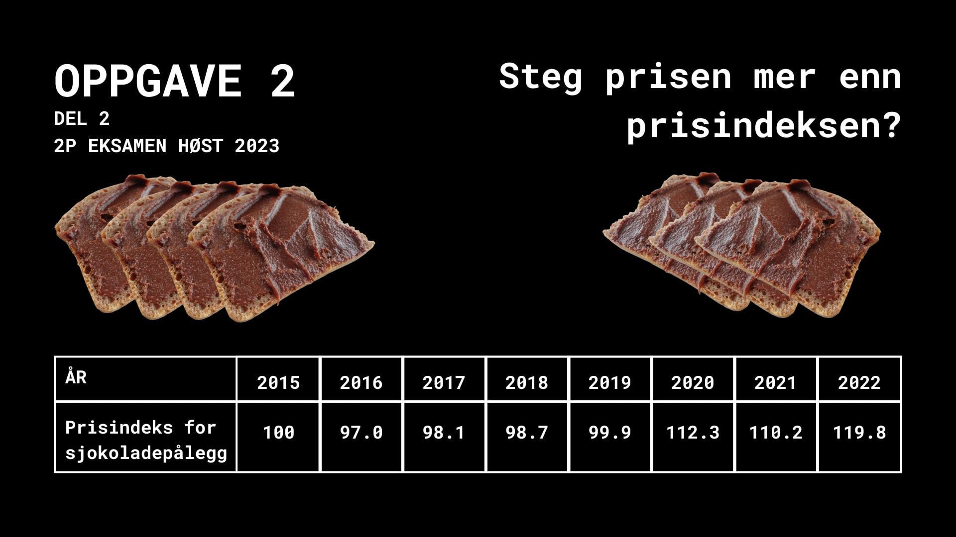Gjør beregninger og finn ut om prisen for dette sjokoladepålegget steg mer enn prisindeksen for sjokoladepålegg fra 2019 til 2022.